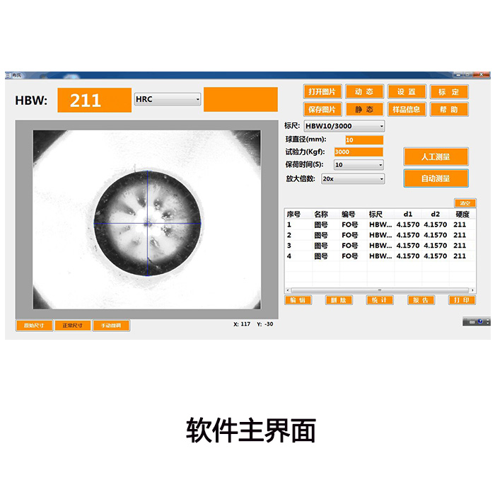 軟件功能:單件測量、批量測量、硬度換算表、數(shù)據(jù)及圖像存儲、數(shù)據(jù)庫查詢、不合格值報警。